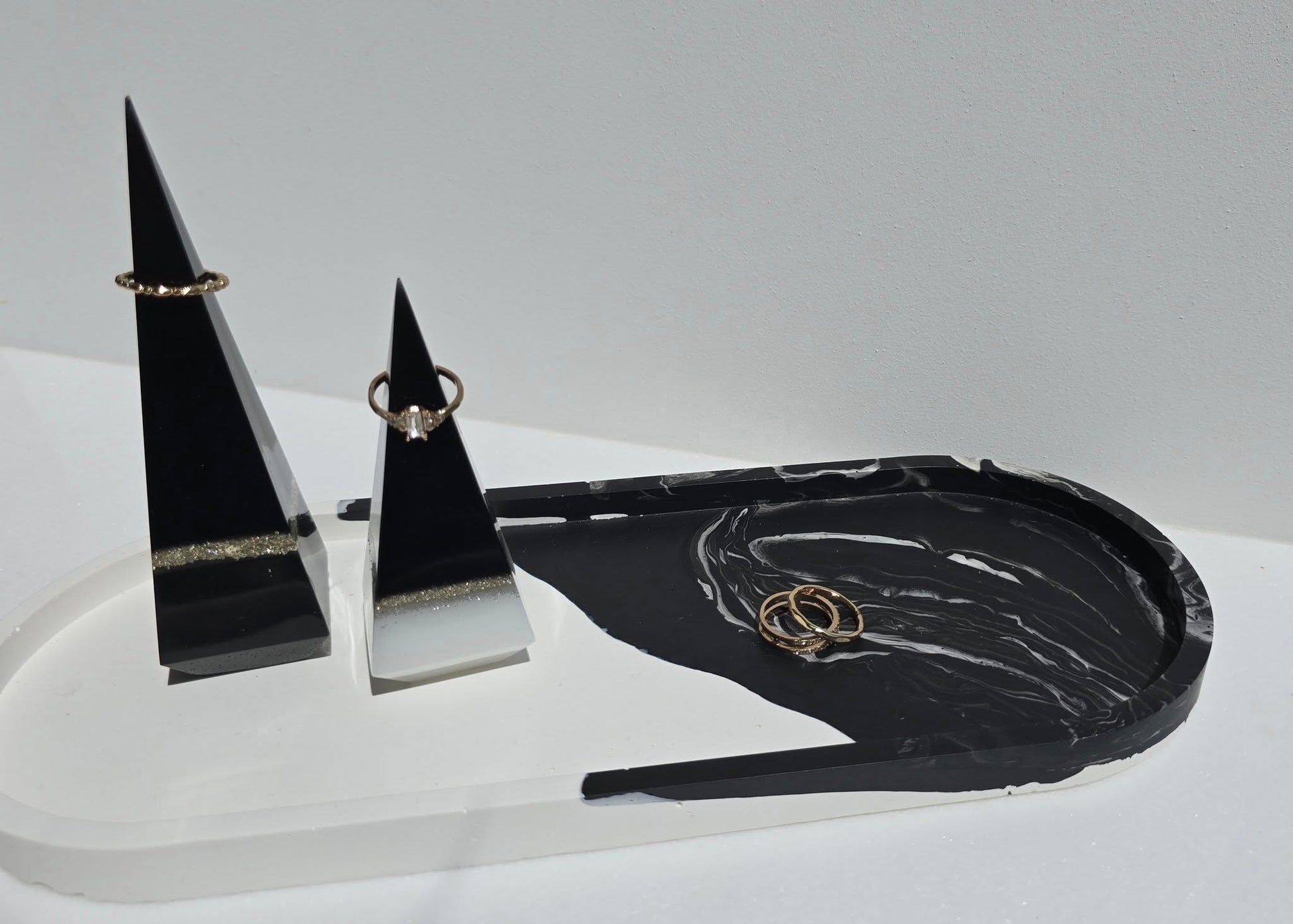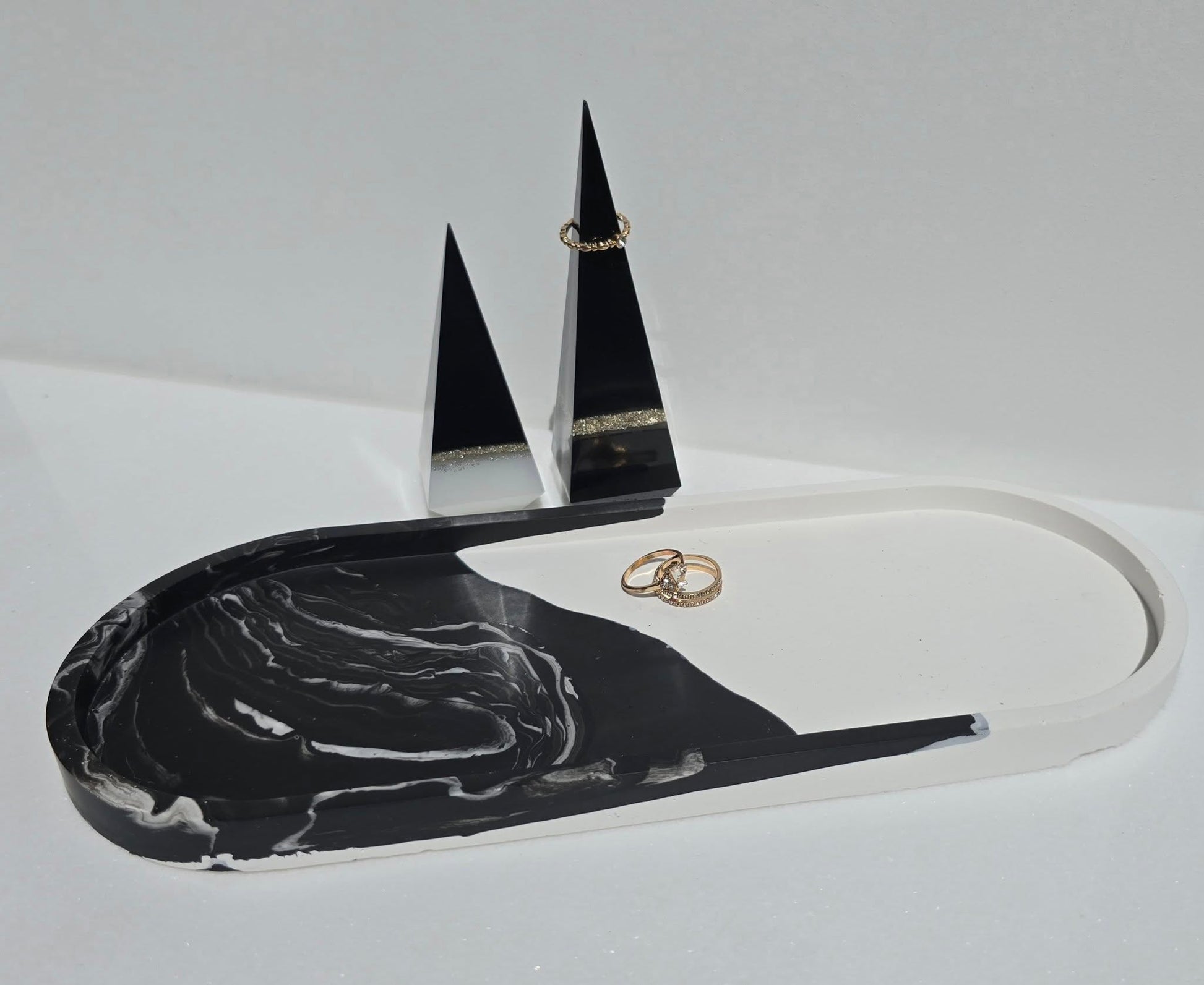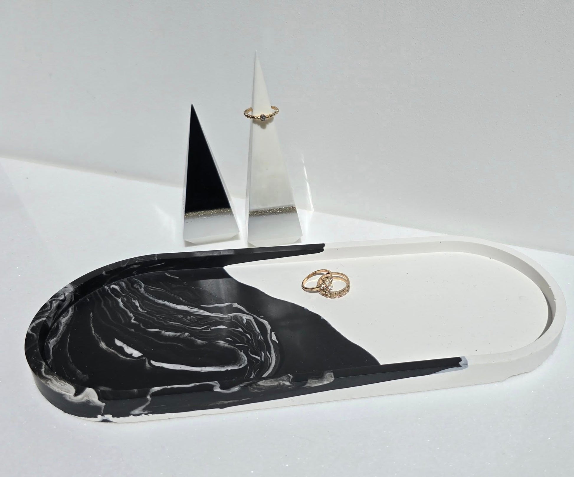 Sleek and sophisticated, this handcrafted long oval vanity tray features a striking marble design in rich ivory and deep black. Made entirely by hand by the artisan, each tray is one of a kind, with natural variations that make every piece truly unique. Its modern, minimalist elegance makes it perfect for styling jewelry, candles, or decor accents. A functional piece of art, designed to elevate any space with effortless style.