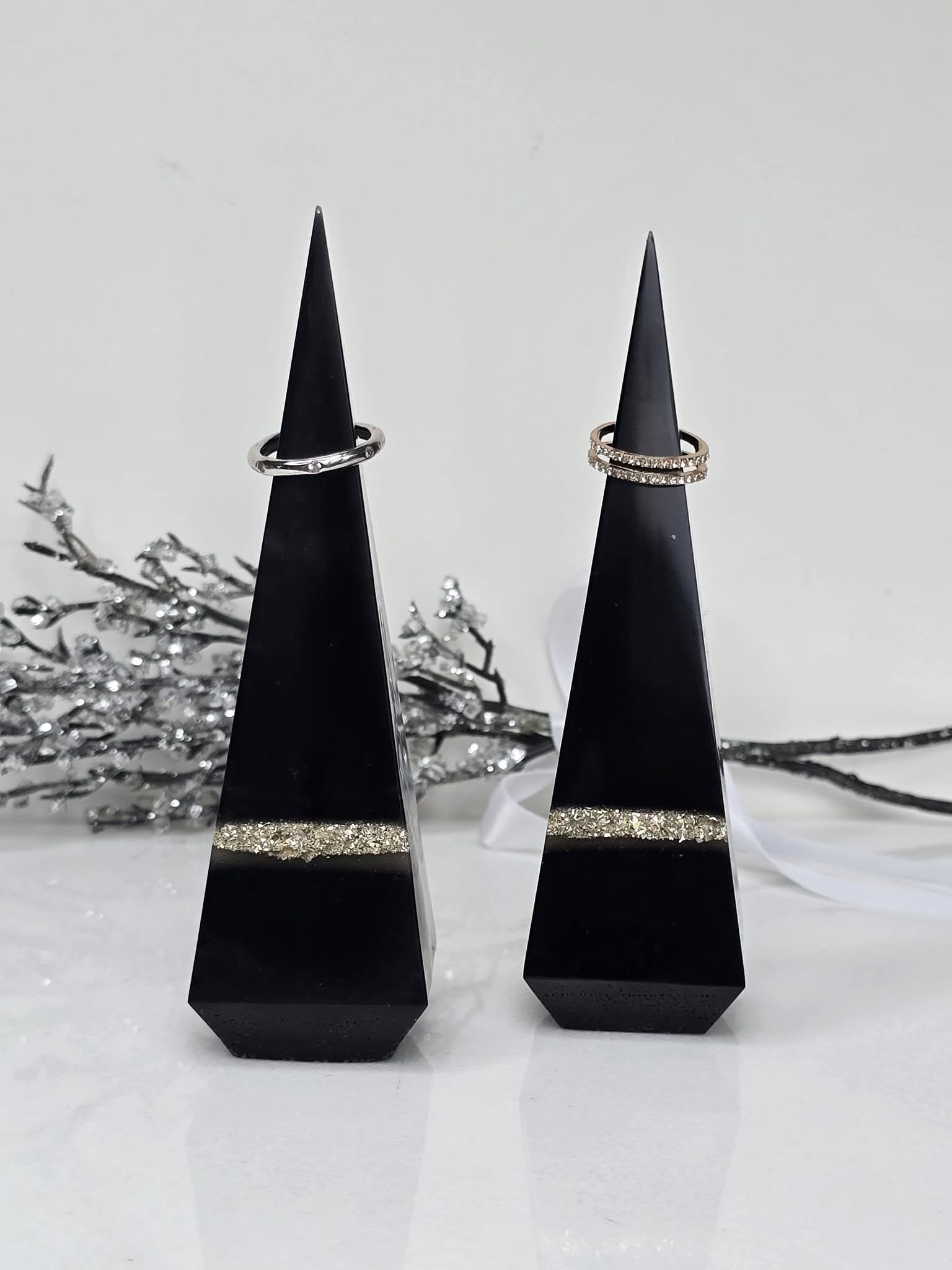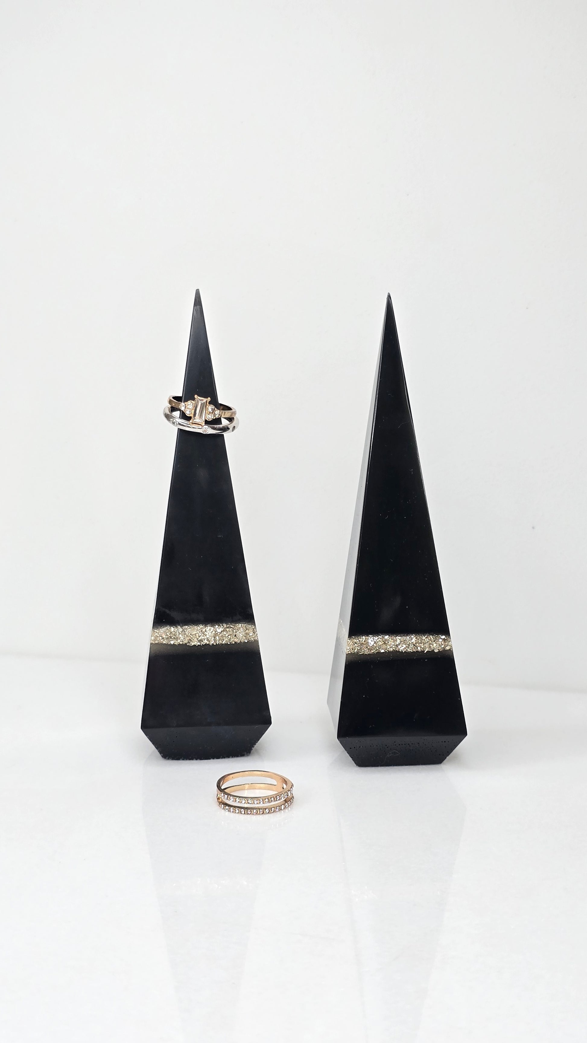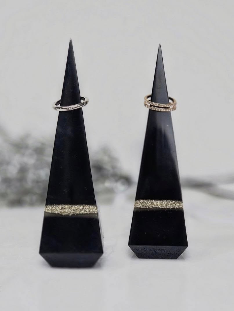 Display your rings in style with these one-of-a-kind pyramid ring holders. Each piece is meticulously handcrafted, ensuring no two are exactly alike. Their unique design and craftmanship make them a functional and artistic addition to your dresser, vanity, or nightstand. Perfectly for keeping your treasured rings safe and adding a modern, elegant touch to your space.