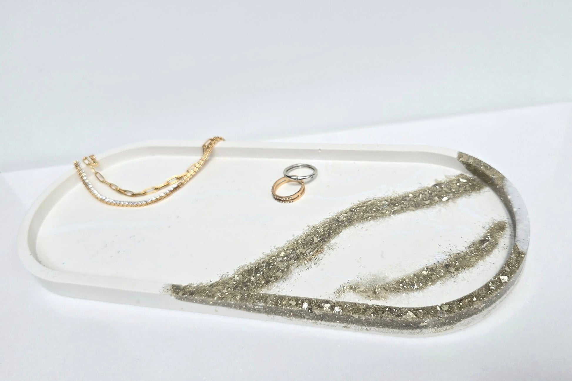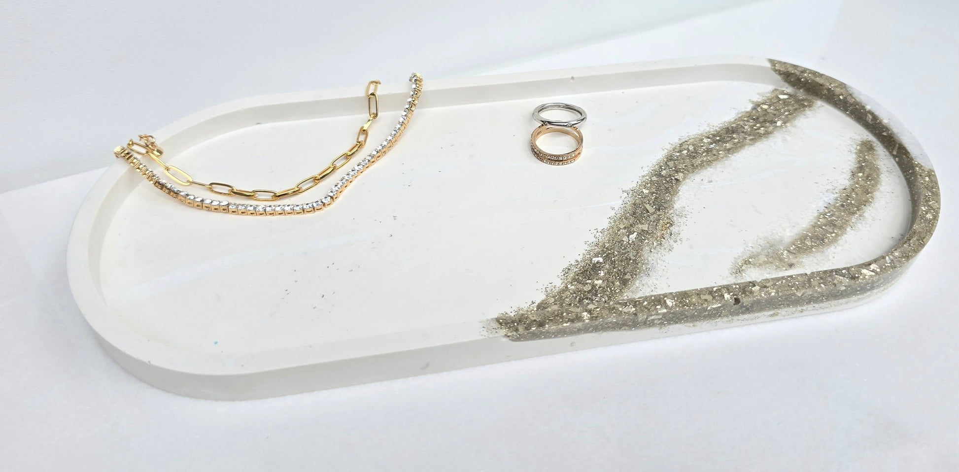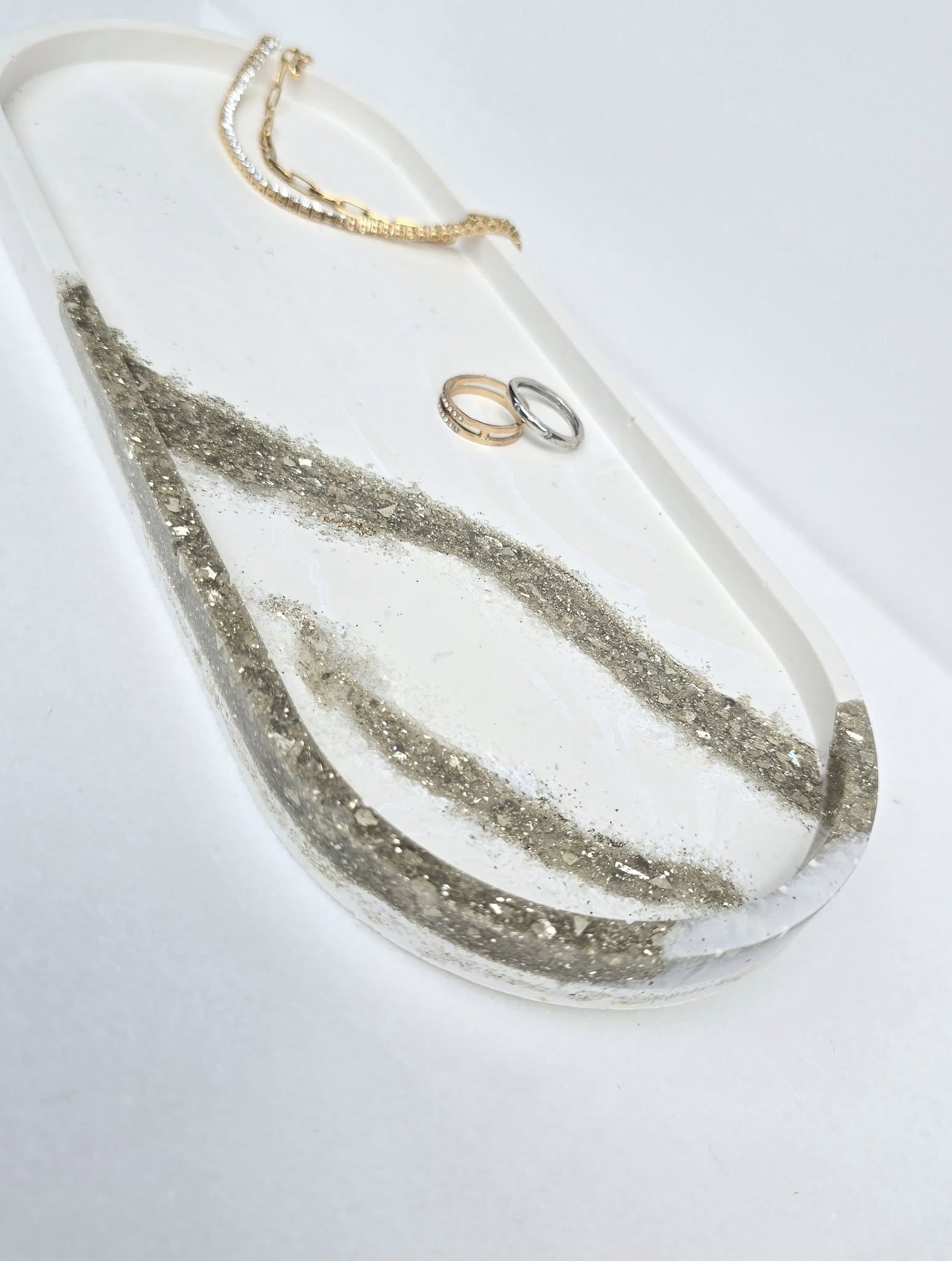 Add a touch of timeless elegance to your space with this handcrafted oval vanity tray. Created by the artisan, this one-of-a-kind piece features a soft, creamy base accented with a luxurious inlay of gold glass glitter. The subtle sparkle catches the light beautifully, offering just the right balance of class and radiance. Perfect for displaying jewelry, perfumes, or cherished keepsakes, this tray blends sophisticated design with artisan craftsmanship — a true functional work of art that is as unique as you are.