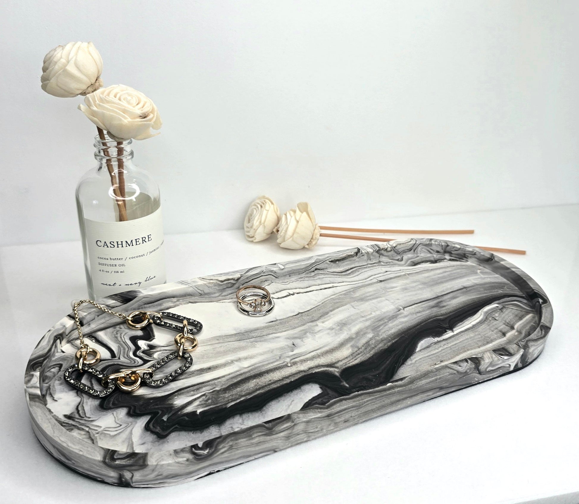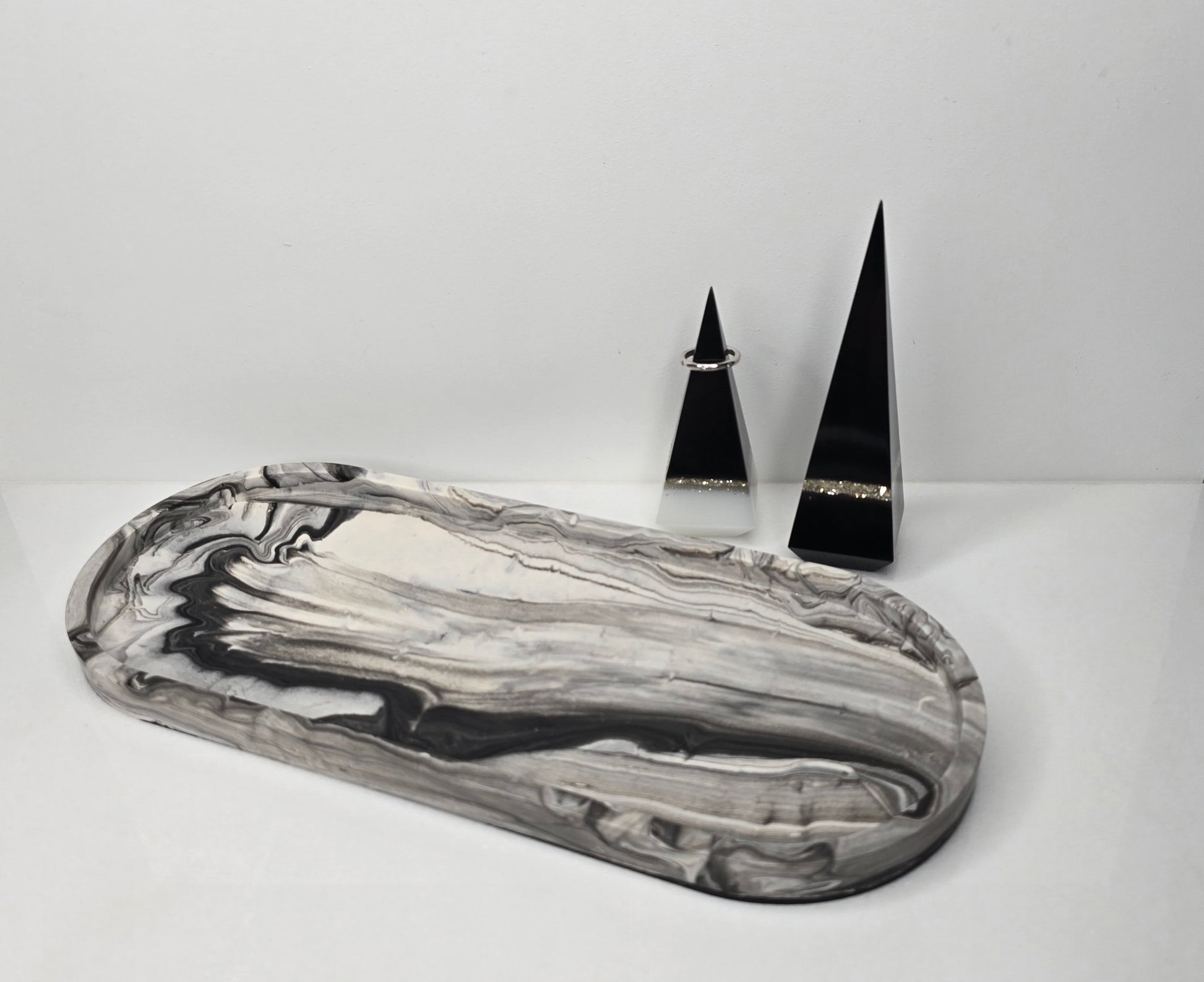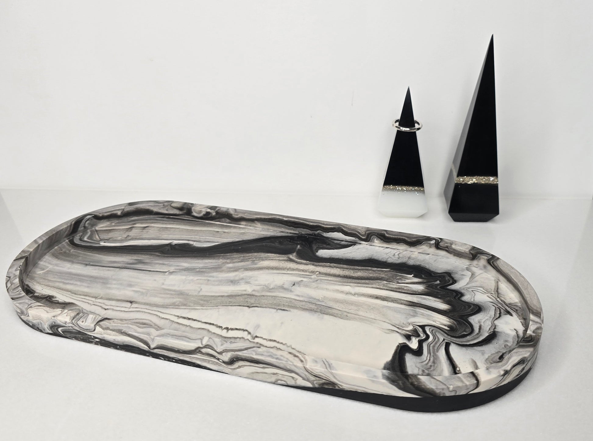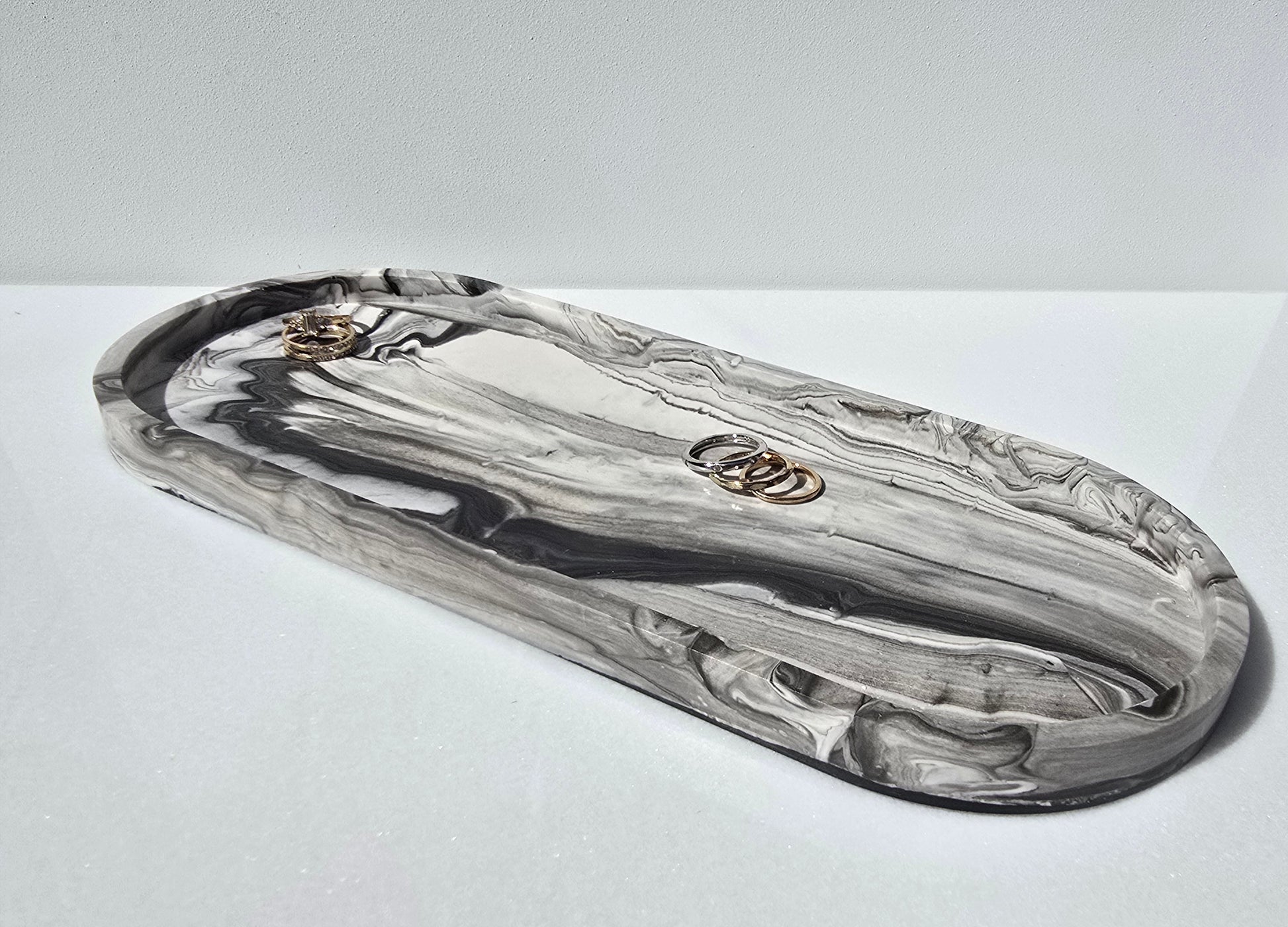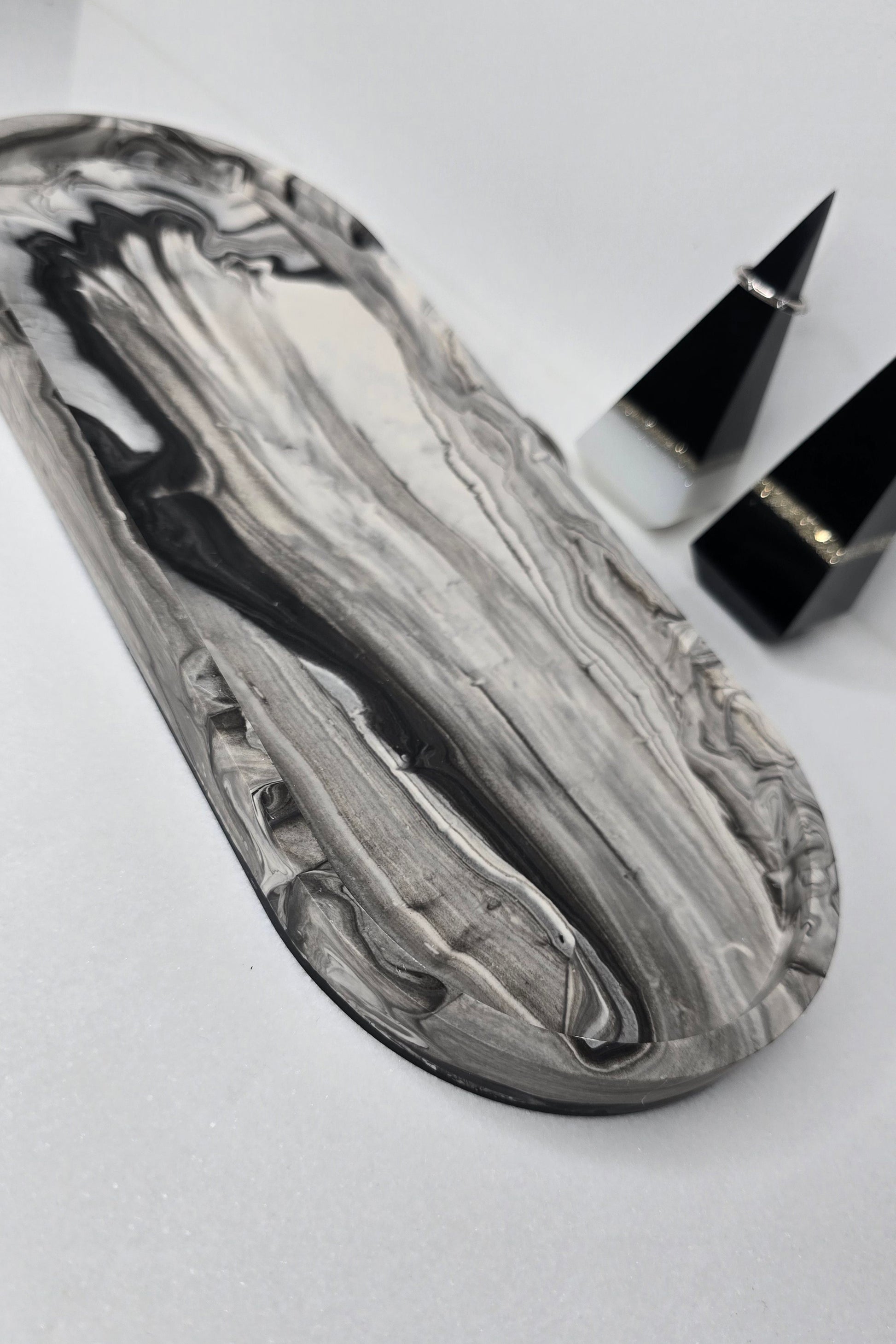 Sleek and sophisticated, this handcrafted long oval vanity tray features a striking marble design in black, grey & white. Made entirely by hand by the artisan, each tray is one of a kind, with natural variations that make every piece truly unique. Its modern, minimalist elegance makes it perfect for styling jewelry, candles, or decor accents. A functional piece of art, designed to elevate any space with effortless style.