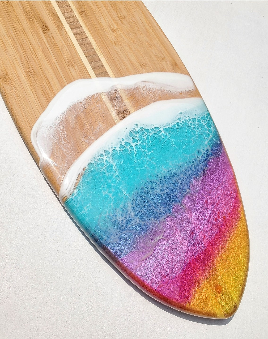 Nautical hardwood surfboard created with 3D layers of resin ocean waves. Perfect for adding a beachy touch to your home decor! Wood has been protected with food-grade mineral oil.